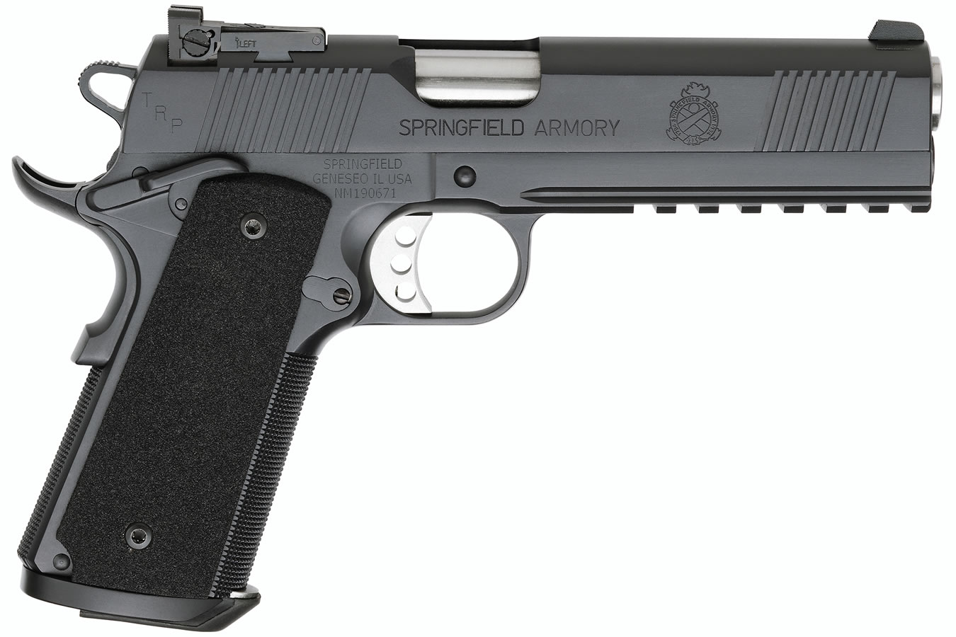 The frame incorporates an integral plunger tube, extended slide stop, and ambidextrous thumb safety. The beavertail grip safety features a memory bump and is fully blended to the frame. The mainspring housing is a flat design with 20 lines-per-inch checkering. The springfield 1911 marine corps operator 45 acp with range bag and 2 magazines ships with a full-length guide rod and a reversed recoil spring plug for simplified disassembly. The ejection port is lowered and flared for consistent ejection.